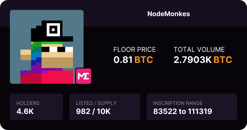 Com suas primeiras inscrições feitas em fevereiro de 2023, os NodeMonkes são aclamados como a primeira coleção original, ou seja, não derivativa, de 10 mil imagens de perfil (PFP) criada via Ordinals. Bitcoin Punks e OnChainMonkeys tiveram inscrições anteriores, embora essas coleções tenham surgido de projetos já existentes.