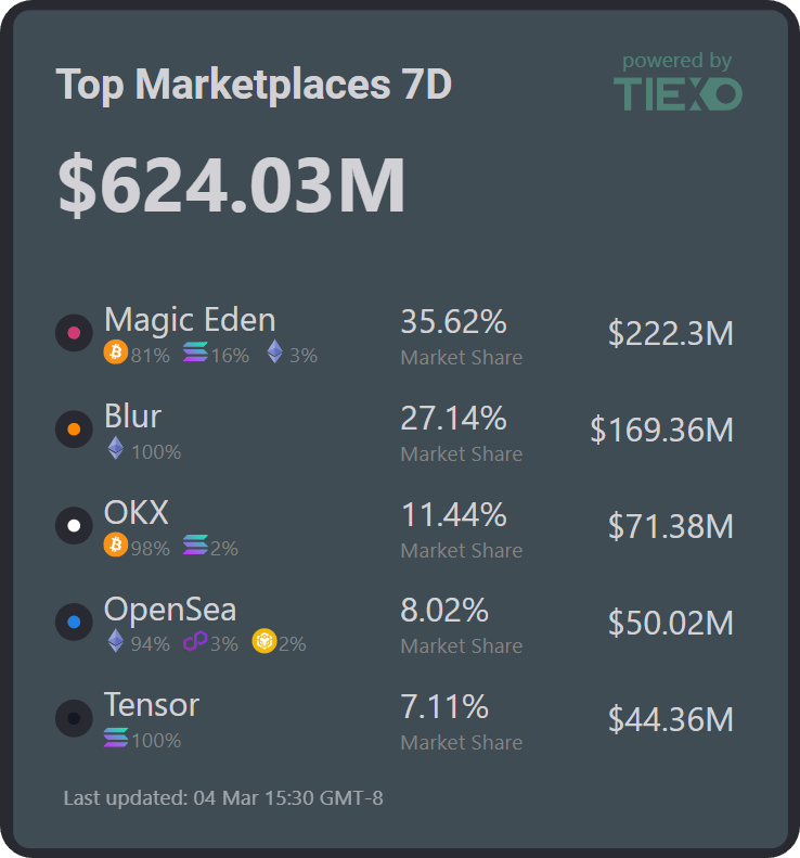 Por exemplo, no último mês, os Nodes estiveram no centro de negociações no valor de mais de $86M, e $11M dessas negociações ocorreram apenas nas últimas 24 horas. Na verdade, as negociações em torno dos Nodes se intensificaram tanto que ajudaram a impulsionar a Magic Eden para a posição de liderança como o principal mercado de NFT em volume nos últimos dias.