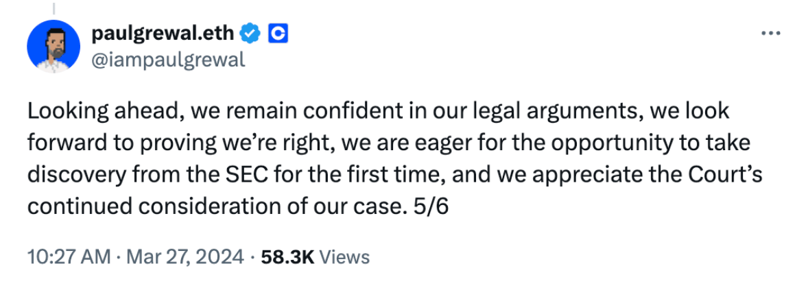 Apesar das esperanças e expectativas da comunidade cripto de que o caso da SEC seria descartado, a batalha legal da Coinbase com a SEC continuará após uma decisão judicial que permitiu que a maioria das reivindicações prossiga, enquanto rejeitava aquelas contra a Coinbase Wallet — uma grande vitória para as carteiras de custódia própria. Sempre otimista, a exchange vê isso como uma maneira de obter insights sobre a posição da SEC em relação à regulamentação das criptomoedas. Seu Diretor Jurídico, Paul Grewal, afirmou que estão prontos para continuar com os procedimentos, enfatizando a importância de desenvolver legislação clara para ativos digitais nos EUA.