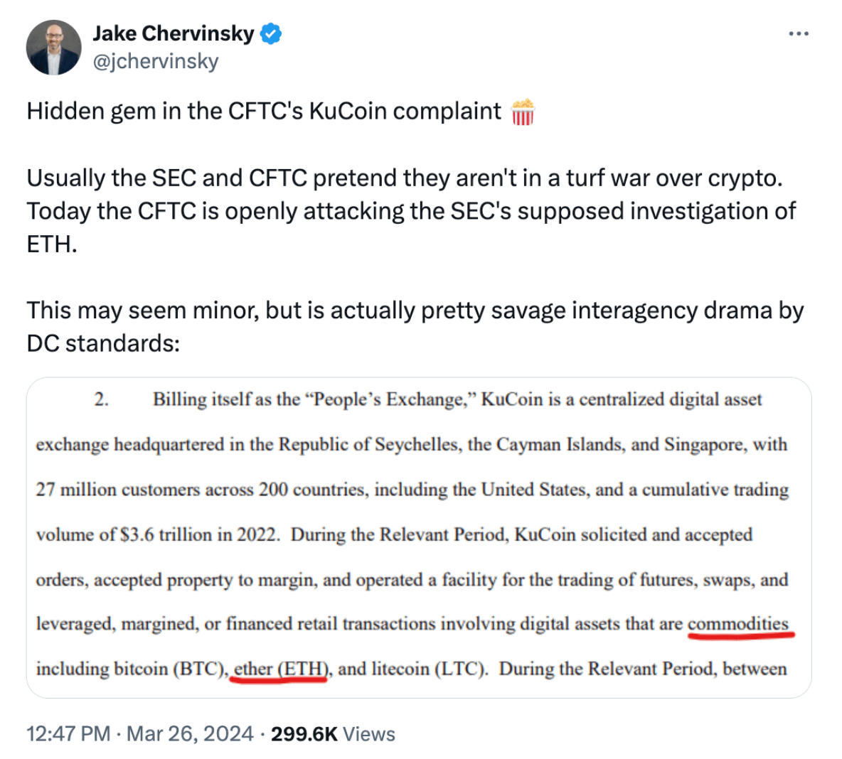 Na última terça-feira, o Departamento de Justiça acusou os fundadores da exchange offshore KuCoin de violar leis de lavagem de dinheiro e de ocultar que tinham muitos clientes dos EUA. Por anos, a KuCoin operou sem requisitos de KYC, adotando-os apenas após ser alvo de investigação federal. Após o anúncio do DOJ, os usuários da KuCoin enfrentaram atrasos substanciais para sacar da exchange — um inconveniente que a KuCoin decidiu compensar com um anúncio de airdrop no dia seguinte para aqueles que tiveram atrasos. Em meio a essa notícia, um easter egg interessante veio do documento da queixa, que definiu o Ethereum como uma mercadoria em seu processo — potencialmente enfraquecendo o caso da SEC.