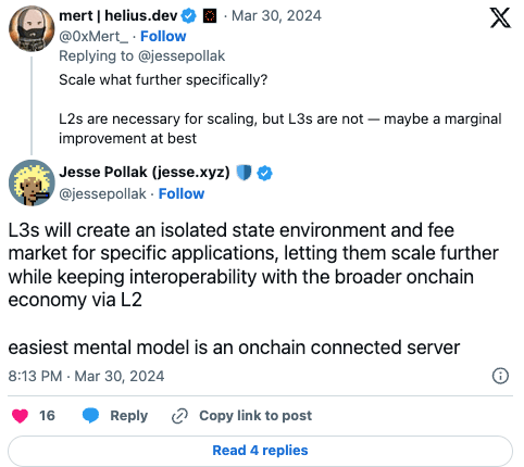 L2s bem-sucedidas estabeleceram marcas para si mesmas — por exemplo, o Blast é o centro para degens, o Base é o centro para consumidores/redes sociais, o Arbitrum é o centro para DeFi/Jogos, e assim por diante. Por sua vez, as L3s que eles atraem provavelmente seguirão esse molde cultural, mantendo a atmosfera onchain e aprimorando ainda mais a capacidade e a reputação da Camada 2.