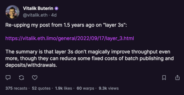 À medida que essas redes ganham tração, elas mostram o potencial da tecnologia para adoção generalizada e iniciam um debate sobre suas implicações para o valor e a dinâmica de segurança do ecossistema Ethereum. Apesar de sua popularidade, é essencial reconhecer que as L3s não aumentam inerentemente a taxa de transações além das capacidades das L2s, diz Vitalik — que também acredita que existem maneiras melhores de escalar. No entanto, elas oferecem reduções em alguns custos operacionais para mover fundos dentro e fora dessas camadas. Outros críticos, como o CEO da Polygon Labs, argumentam que as L3s podem diluir o valor fundamental da Ethereum e contribuir para a centralização.