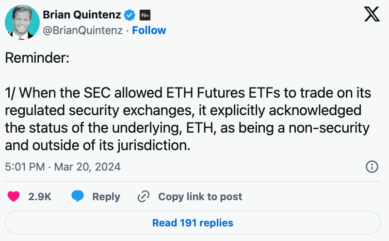 Essa decisão ocorreu após a transição do Ethereum para PoS, indicando que a SEC já cedeu a jurisdição sobre o ativo e solidificou seu status como uma commodity, já que os instrumentos seriam ilegais (e, portanto, não negociáveis) se o ativo subjacente fosse um valor mobiliário.