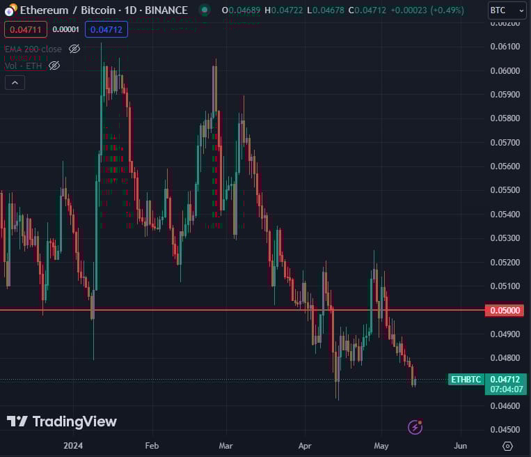 Enquanto as probabilidades implícitas do mercado de previsão de aprovação aumentaram ligeiramente, a proporção ETH/BTC caiu mais 2% neste fim de semana, se somando às perdas acumuladas ao longo de maio; atualmente está abaixo do nível-chave de 0,05 e está pressionado para mínimas de 2024.