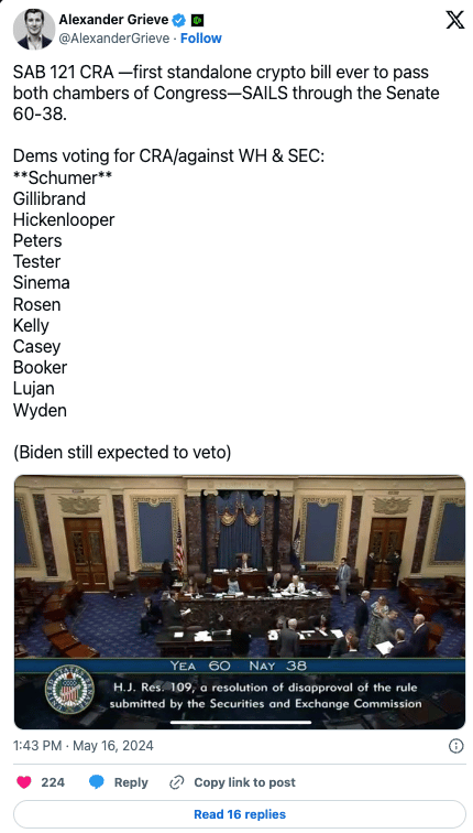 Em uma votação de 60 a 38, o Senado acabou de se mover para revogar o Boletim de Contabilidade da Equipe nº 121 (SAB 121) da SEC, uma política que exige que as empresas que custodiam criptomoedas registrem as participações dos clientes em seus balanços como passivos.