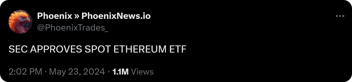 Às 17h02, finalmente chegou: as notícias informaram que todos os ETFs de ETH à vista propostos haviam sido aprovados, resultando em um modesto rali de 4% no preço do Ether.
