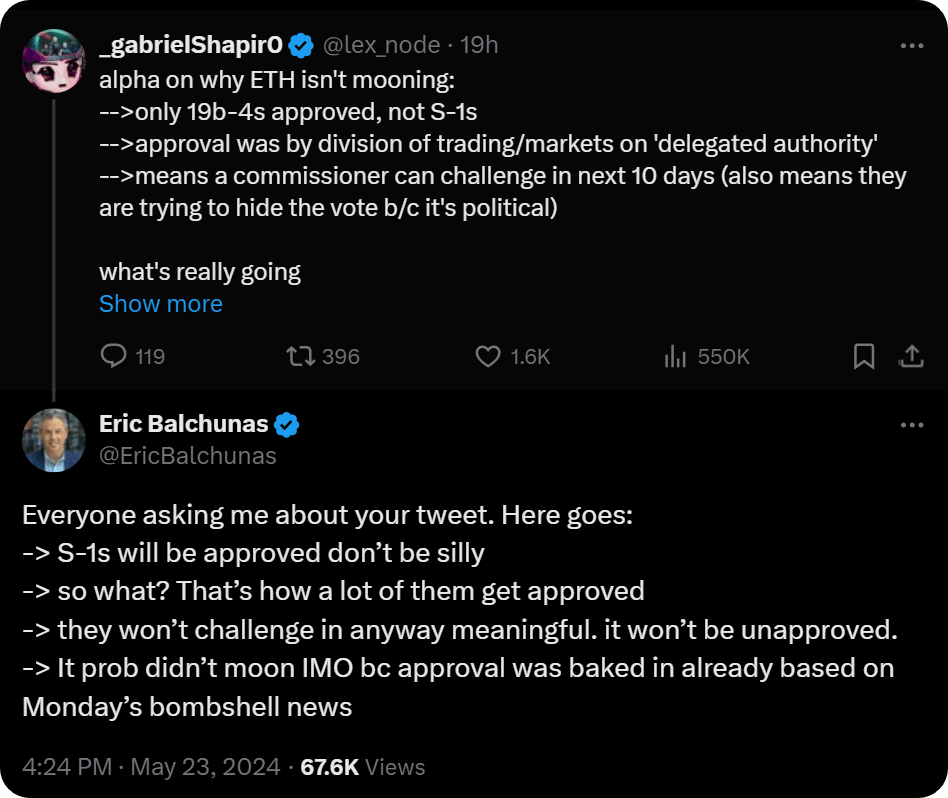 Sem a aprovação da SEC dos arquivamentos de registro S-1 dos emissores, dado que ainda há uma possibilidade não remota de a SEC revogar as aprovações 19b-4, e considerando que o cronograma para o início das negociações dos ETFs de ETH à vista permanece incerto, pode ser um pouco exagerado afirmar que esses instrumentos foram totalmente aprovados.