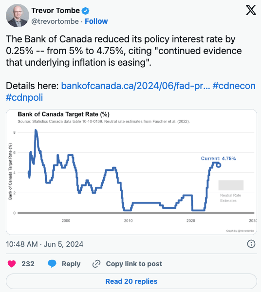 Na manhã de hoje, o Banco do Canadá (BOC) reduziu sua meta de taxa de juros overnight em 0,25%, para 4,75%, o primeiro corte do banco em quatro anos e o primeiro caso de uma nação do G7 adotando uma política monetária mais frouxa na era pós-COVID.