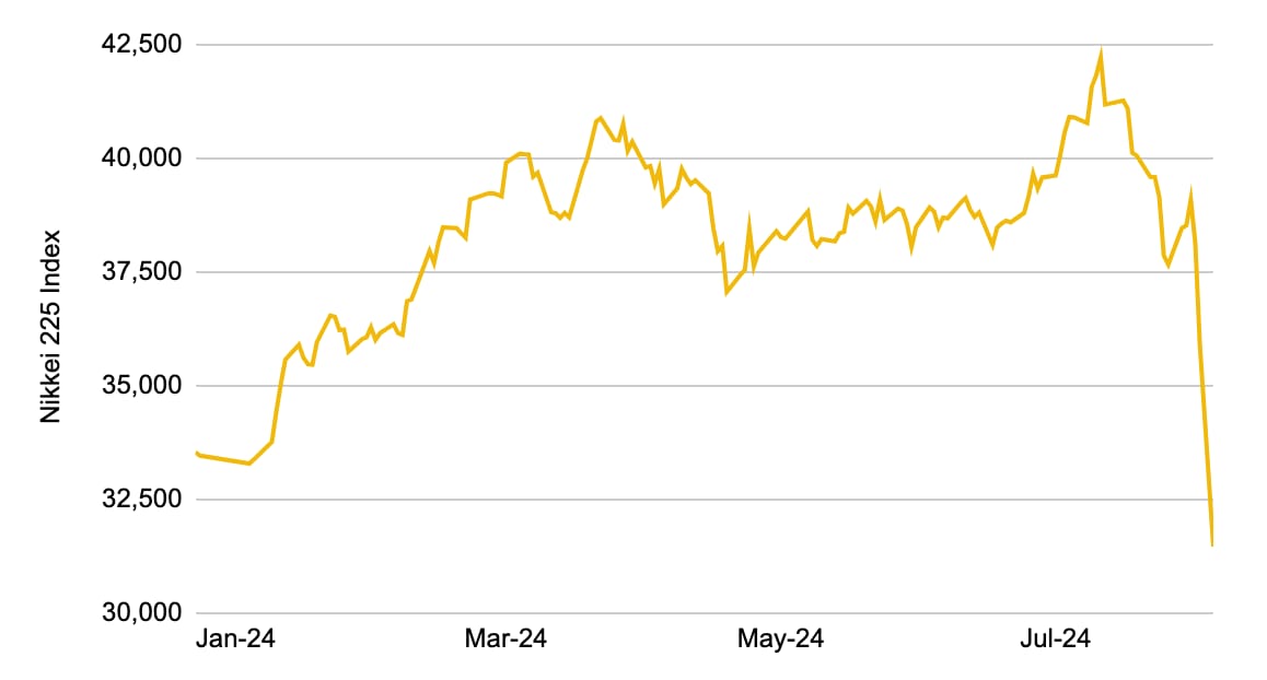 As ações de Tóquio foram afetadas por uma moeda fortalecida, já que o iene japonês se valorizou cerca de 12% desde meados de julho. Isso segue um aumento da taxa de juros pelo Banco do Japão, que efetivamente causou muita dor para os investidores que adotaram a estratégia de "carry trade" (emprestar ienes, que tinha uma taxa de juros baixa, e reinvestir os proventos em uma moeda com maior taxa de retorno, como o dólar dos EUA). O iene forte também resultou em pressão de venda dos investidores mencionados que estão pagando suas dívidas em ienes, o que foi um contribuinte para os preços mais baixos das ações dos EUA.