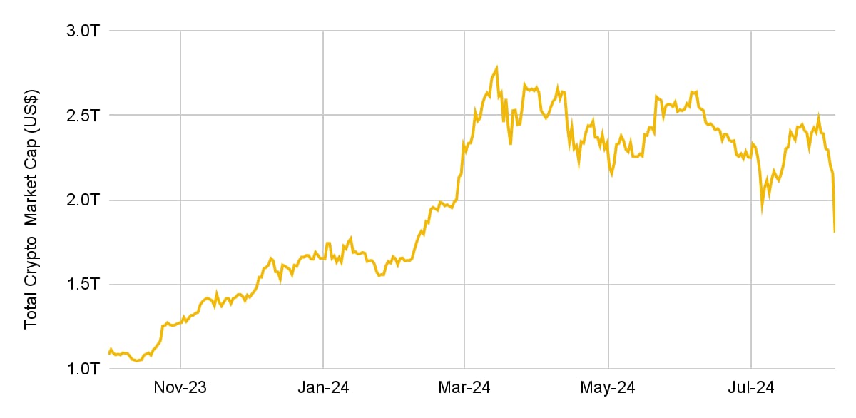 Índices de mercados de ações globais negociaram significativamente mais baixos nos últimos dias de negociação. Preocupações com um pouso forçado nos EUA e uma queda significativa nos mercados de ações de Tóquio deixaram os investidores em alerta. O sentimento de aversão ao risco se espalhou para o mercado cripto, à medida que os investidores exerceram cautela e retiraram suas fichas da mesa.