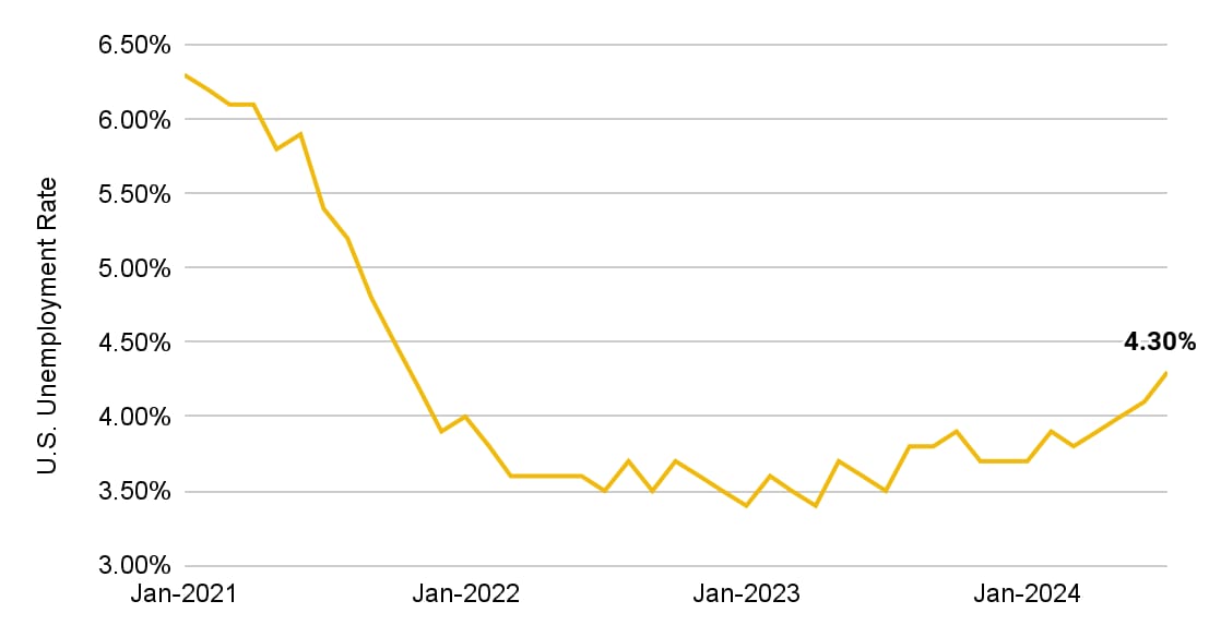 As preocupações com uma recessão nos EUA aumentaram após dados de emprego mais fracos do que o esperado na última sexta-feira. A taxa de desemprego subiu para 4,3%, o nível mais alto desde outubro de 2021, e o crescimento do emprego em junho foi inferior ao esperado (folha de pagamento não agrícola aumentou em 114.000 vs. 175.000 esperados). Isso provocou uma ampla venda de ações dos EUA, com o Nasdaq sendo o primeiro grande índice do mercado de ações dos EUA a entrar em território de correção, com uma queda superior a 10% em relação ao seu recorde histórico. No geral, os dados ruins levantaram preocupações entre os investidores de que o Federal Reserve poderia estar lento demais em reduzir as taxas de juros para evitar uma recessão.
