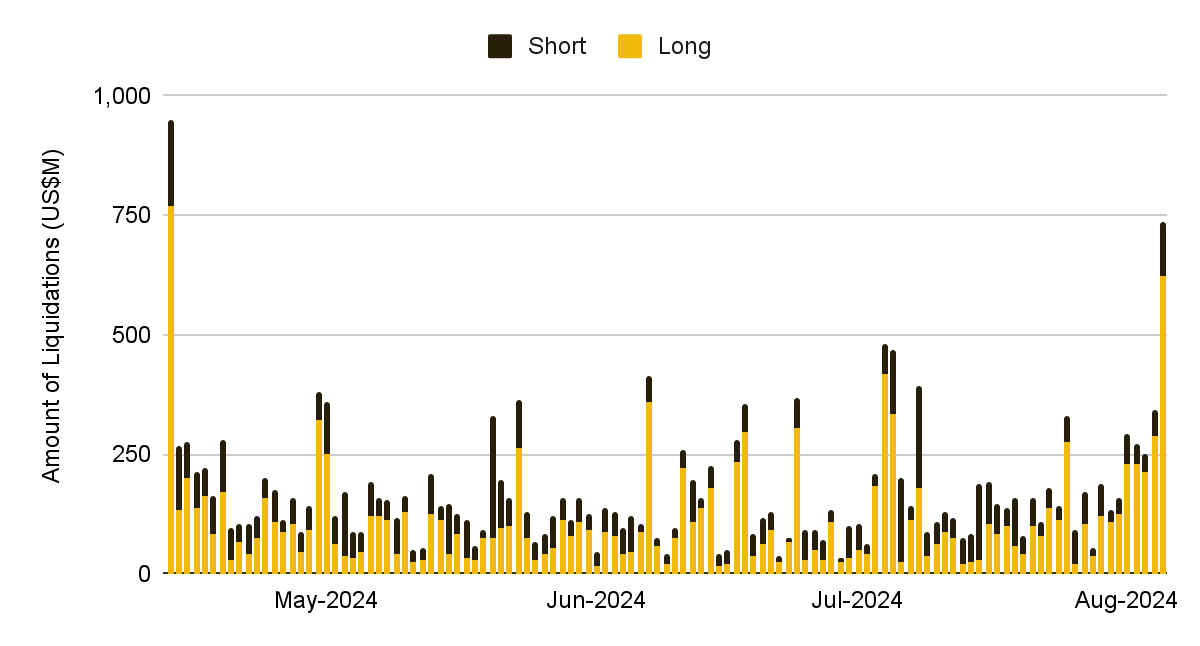 A queda nos preços dos tokens também desencadeou liquidações significativas. Traders em grandes exchanges experimentaram mais de US$819M em liquidações (~US$688M em longs, ~US$131M em shorts) em 5 de agosto, o maior volume diário de liquidações desde 13 de abril de 2024.