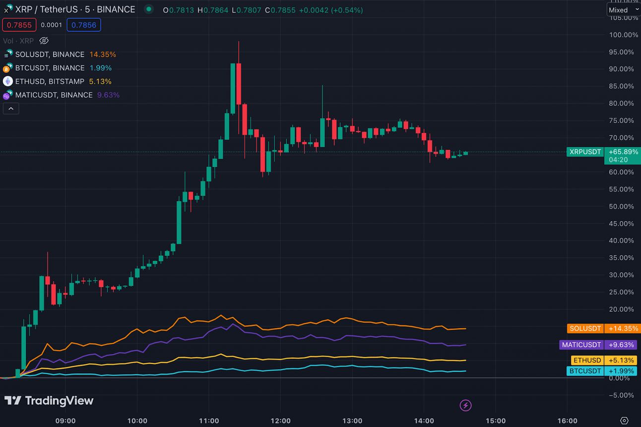O XRP rasgou absolutamente e os ativos de primeira linha visados pelas ações de execução anteriores da SEC bombearam mais do que a maioria nas notícias, com SOL e MATIC alcançando ganhos de dois dígitos.