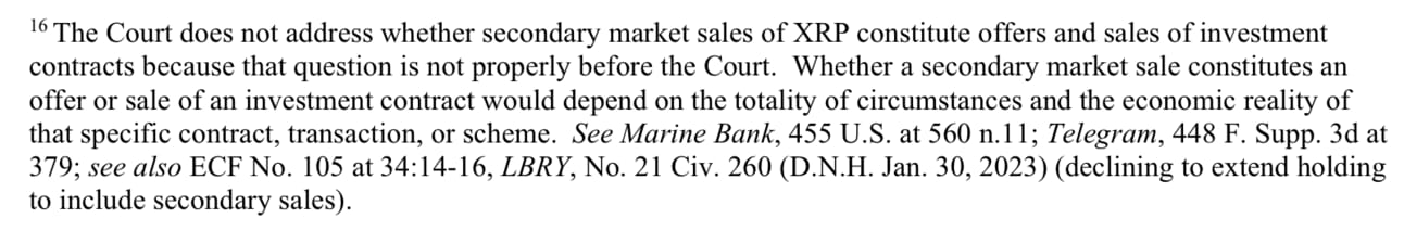 Além disso, o Tribunal constatou que as distribuições de tokens XRP para pagar funcionários e compensar terceiros pelo desenvolvimento do XRP e do XRP Ledger também não eram vistas como contratos de investimento, pois não havia infusão de capital do investidor na Ripple sob esse esquema.